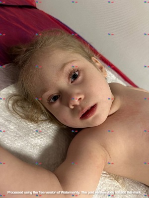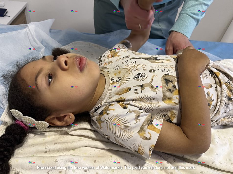 мікроцефалія, спастичний тетрапарез з відсутністю самостійного сидіння, стояння та ходи. Епісиндром (генералізовані міоклонічні напади), затримка психо-мовленнєвого розвитку. Згинально-пронаторна контрактура лівого плечового суглобу, вивих голівки лівої променевої кістки, підвивих обох стегон, вальгусна установка обох ступнів, coxa valga