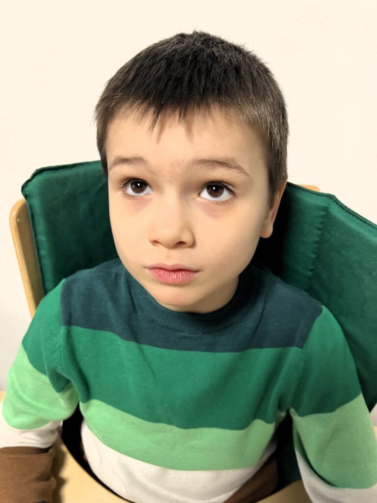G80.0. ДЦП. Спастичний правосторонній геміпарез. Рухові порушення V рівня по GMFCS. Компенсована гідроцефалія (шунтована). Часткова атрофія зорових нервів. Східна косоокість справа. Затримка психомовного розвитку. Дисфункція емоційно-вольової сфери
