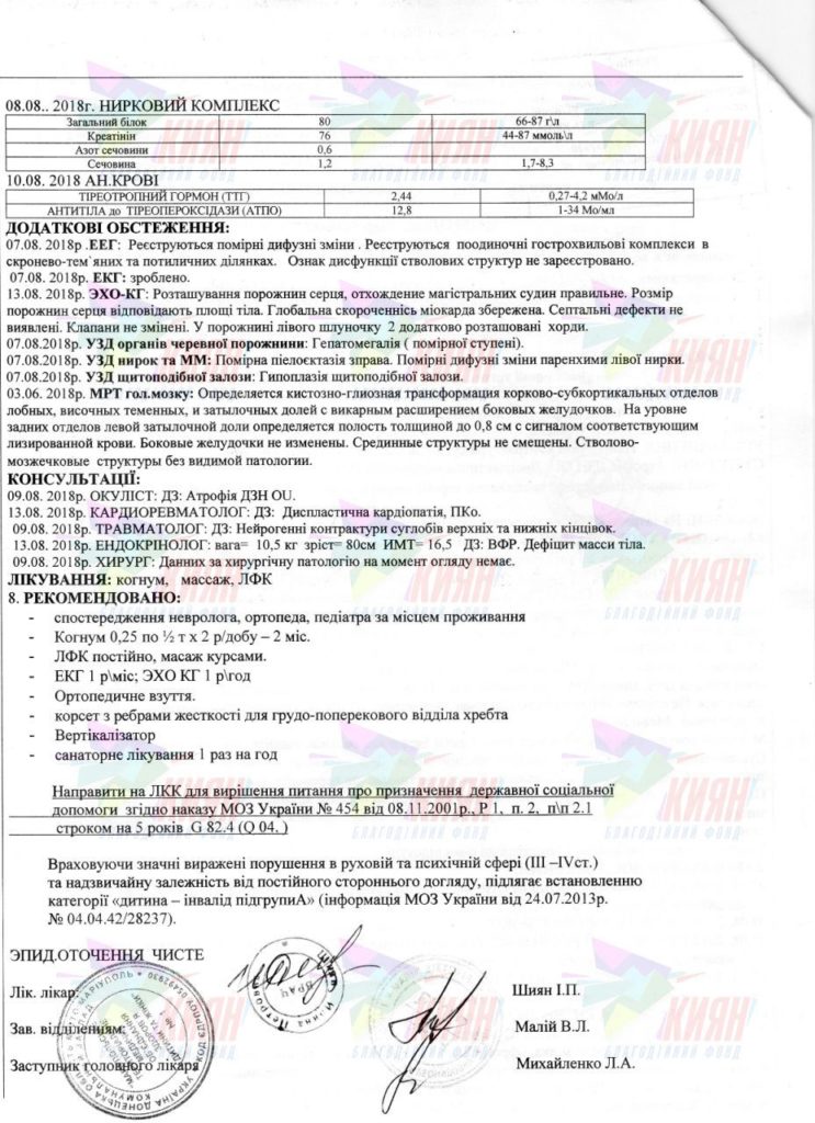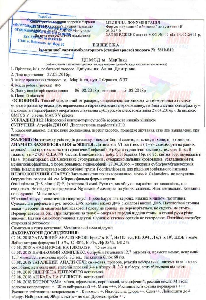 Диагноз: наслідки ішемічно-гемічного враження ЦНС, хронічна субдуральна гідрома лівої тім’яно-потиличної області, затримка психомоторного розвитку, дизартрія, спастична диплегія, структурна епілепсія, вроджена часткова атрофія ДЗН обох очей