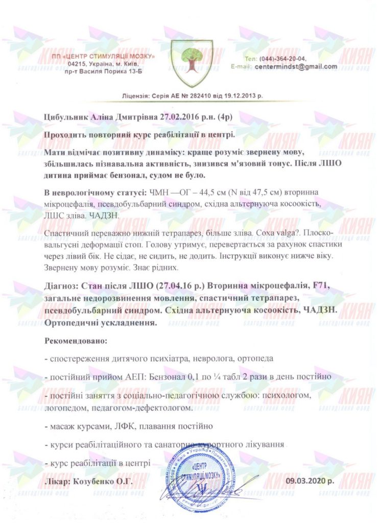 Діагноз: наслідки ішемічно-гемічного враження ЦНС, хронічна субдуральна гідрома лівої тім’яно-потиличної області, затримка психомоторного розвитку, дизартрія, спастична диплегія, структурна епілепсія, вроджена часткова атрофія ДЗН обох очей