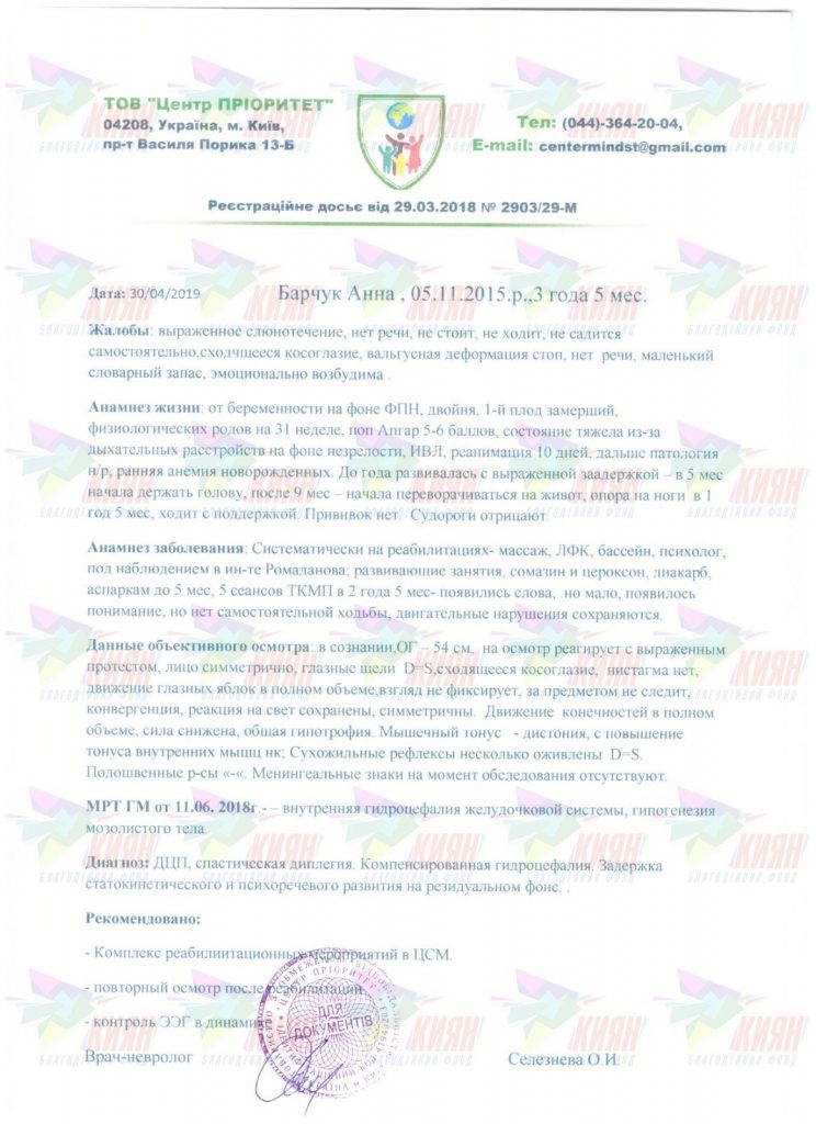 Діагноз: ДЦП, спастична диплегія, компенсована гідроцефалія, затримка статокінетичного і психомовленнєвого розвитку на резидуальному фоні