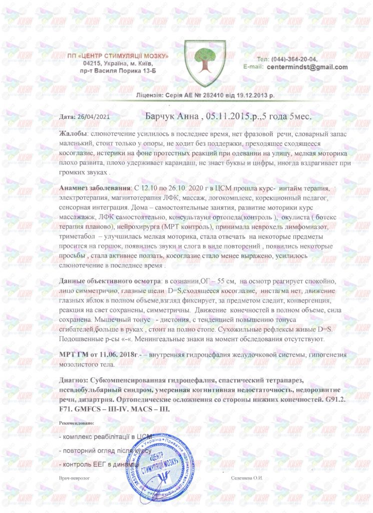 Діагноз: ДЦП, спастична диплегія, компенсована гідроцефалія, затримка статокінетичного і психомовленнєвого розвитку на резидуальному фоні