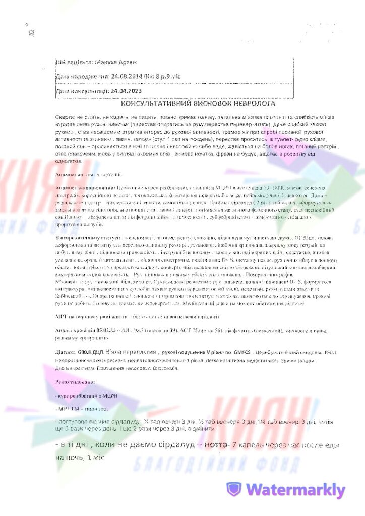 Діагноз: ДЦП, спастичний тетрапарез, псевдобульварний синдром, затримка всіх видів розвитку, перинатальна енцефалопатія, натальна травма ШВХ