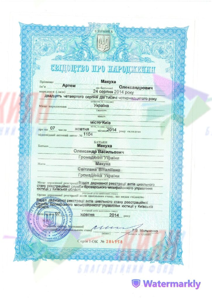 Повне ім’я: Макуха Артем Олександрович, 24.08.2014 р.