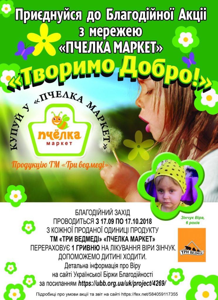 Мережа магазинів «Пчелка маркет» та бренд «Три Ведмеді» у вересні 2018-го року розпочинають благодійний проект заради підтримки Віри Зінчук (6 років). Захід проводиться разом з благодійним фондом «Киян». Детальна інформація про історію хвороби дитини на сайті фонду: https://ubb.org.ua/uk/project/4269/ . Гроші, зібрані в процесі акції, будуть направлені на лікування Вірочки Зінчук.