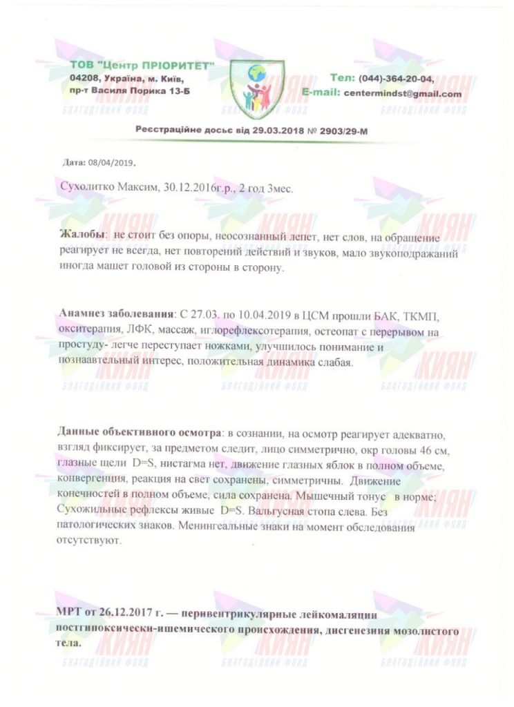 Інтелект малюка збережено, він розумний та допитливий. А якщо з Максимом систематично займатися, то згодом він буде ще й здоровим! Хлопчик уже провів декілька курсів лікування в центрі «Пріоритет», і результат очевидний.Максим старається самостійно сидіти і повзати, цікавиться іграшками, тягне за ними свої рученята. А ще хлопчик почав самостійно тягнути до рота їжу і намагається відкушувати шматочок. Такі результати можливі завдяки Вашій підтримці!