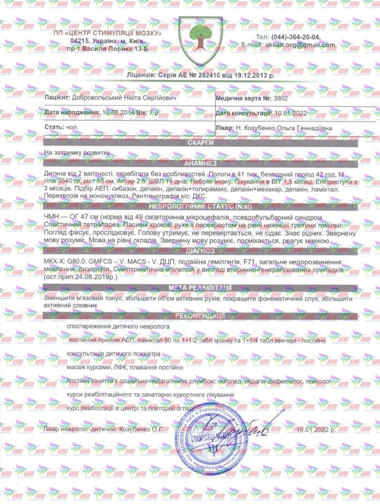 Лікарі відмічають, що після останнього курсу лікування Микита зміцнів, його спина стала рівнішою, а шия та ручки зміцніли, хлопчик уже добре розуміє цифри, у нього покращилася просторова орієнтація. А ще Микита майже цілих 2 хвилини може самостійно утримувати голову! Це дуже гарні результати, і переривати лікування не можна ні на хвилинку.