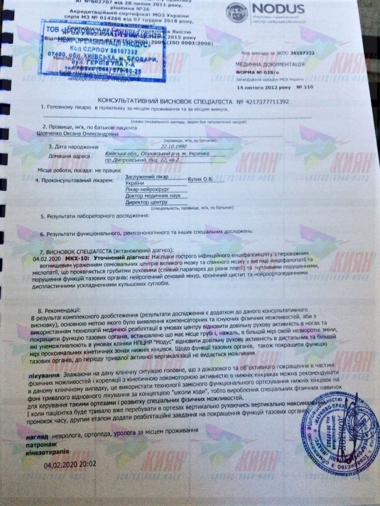 Але завдяки вам, шановні донори, Оксана змогла відвідати реабілітаційний центр «Нодус», де їй нарешті встановили діагноз: наслідки гострого інфекційного енцифаломієліту з ураженням великого та спинного мозку. Оксана зараз пересувається в інвалідному візку, вона втрачає вагу, у неї не працює сечовий міхур. Лікарі зараз рекомендують використовувати технологію замісного функціонального ортезування нижніх кінцівок, вона дозволить Оксані вчитися заново ходити, а також є вірогідність відновити роботу сечового міхура.