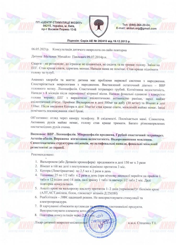 Пізніше до цього “букету” додався ще V рівень рухових порушень і псевдобульбарна дизартрія. Коли Міші виповнилось 8 місяців, хлопчик захворів на вітряну віспу, після чого у нього з’явились судоми, а вони згодом перетворилися на симптоматичну епілепсію.