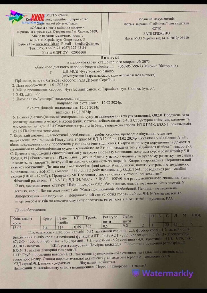 Народившись, маленька Дарина не дихала. Крихітку негайно відправили до відділення інтенсивної терапії, де вона провела 21 день, 17 із яких провела під апаратом ШВЛ. Лікарі виявили в дівчинки гіпоксично-ішемічне ураження головного мозку та асфіксію важкого ступеня.
