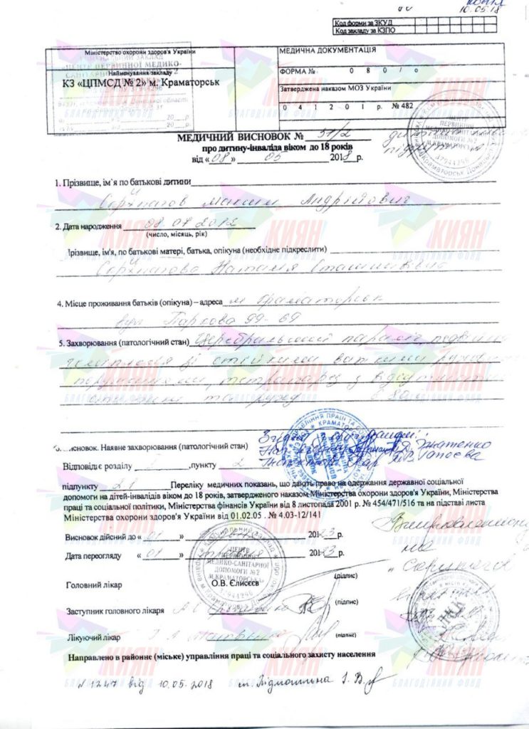 Диагноз: ДЦП, симптоматична епілепсія, груба затримка всіх видів розвитку (5 рівень по GMFCS), часткова атрофія ДЗІ, диспластична кардіопатія, спастичний тетрапорез, контрактури стегон, 2-стороння соха valga