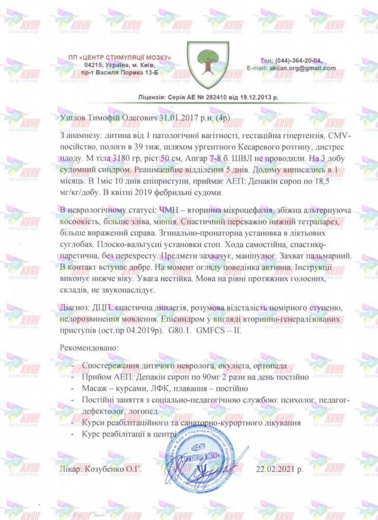 Хлопчика з мамою виписали додому, проте ненадовго: через 10 днів вони знову потрапили в лікарню – у Тимофія знову були судоми. Препарати, які призначили хлопчикові, він приймає й донині. З часом історія хвороби дитини поповнилися новими діагнозами: до епісиндрому додалися ще ДЦП та затримка розвитку.