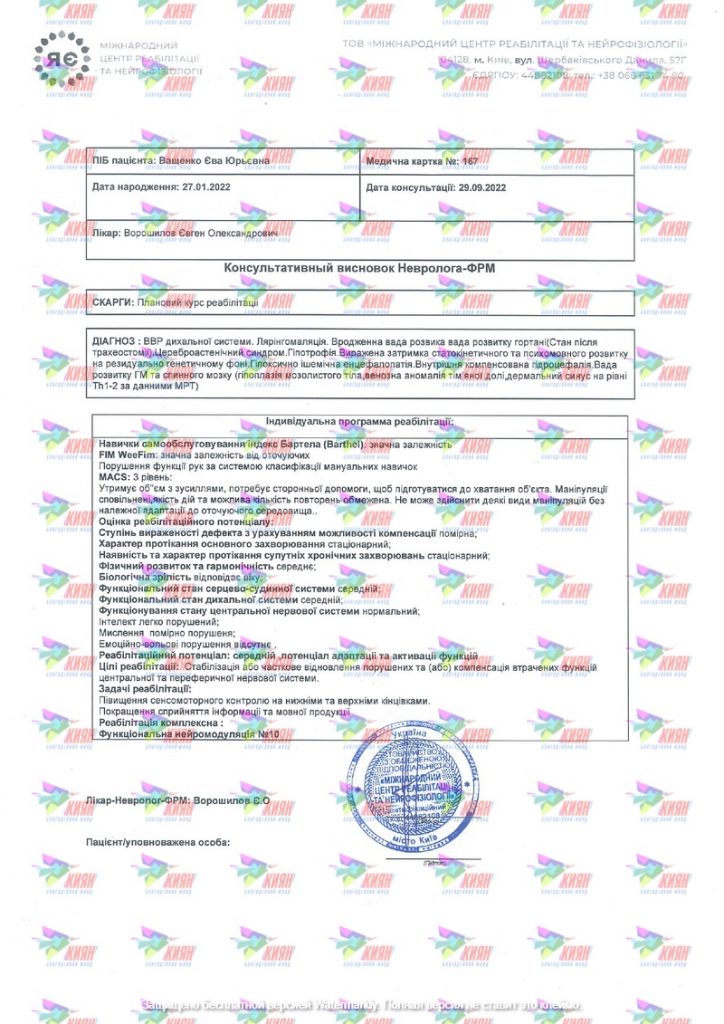 Діагноз: Вроджена вада розвитку дихальної системи. Ларингомаляція. Вроджена вада розвитку гортані (стан після трахеостомії). Цереброастенічний синдром. Гіпотрофія. Виражена затримка статокінетичного та психомовного розвитку на резидуально генетичному фоні. Гіпоксично ішемічна енцефалопатія. Вада розвитку ГМ та спинного мозку. Синдром Маршалла-Сміта.