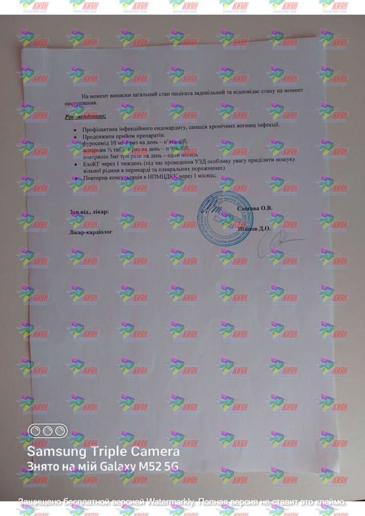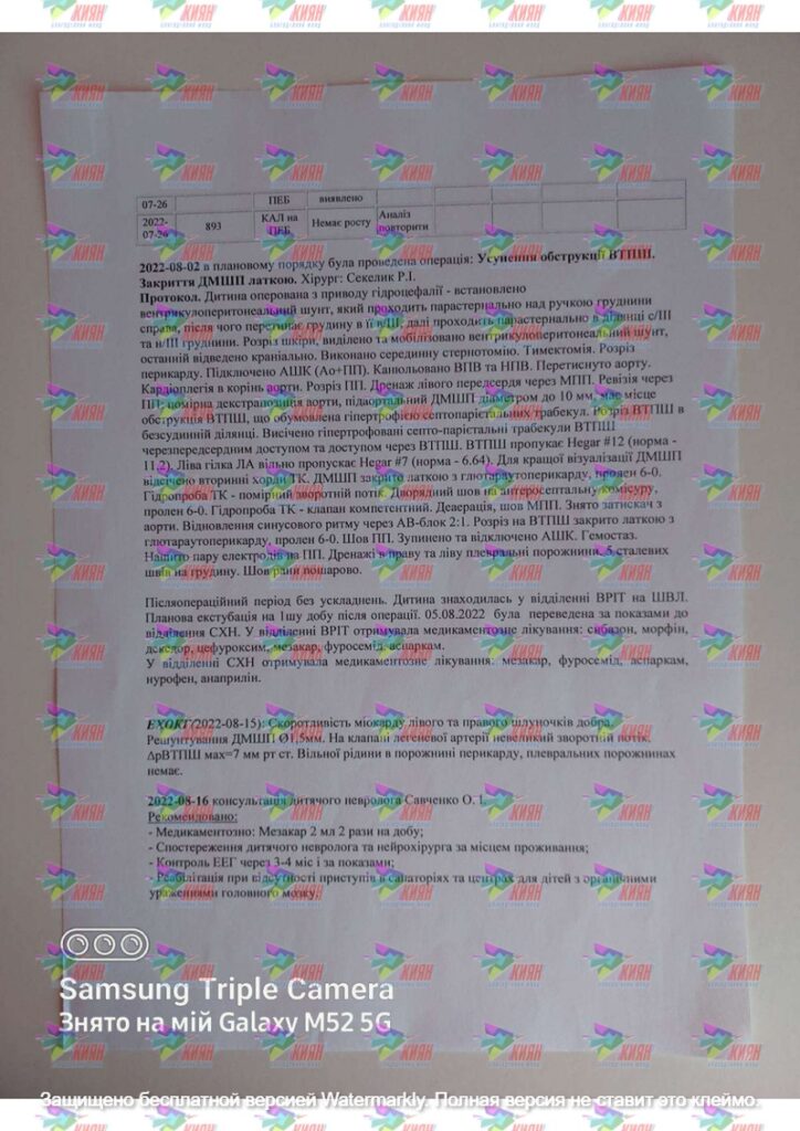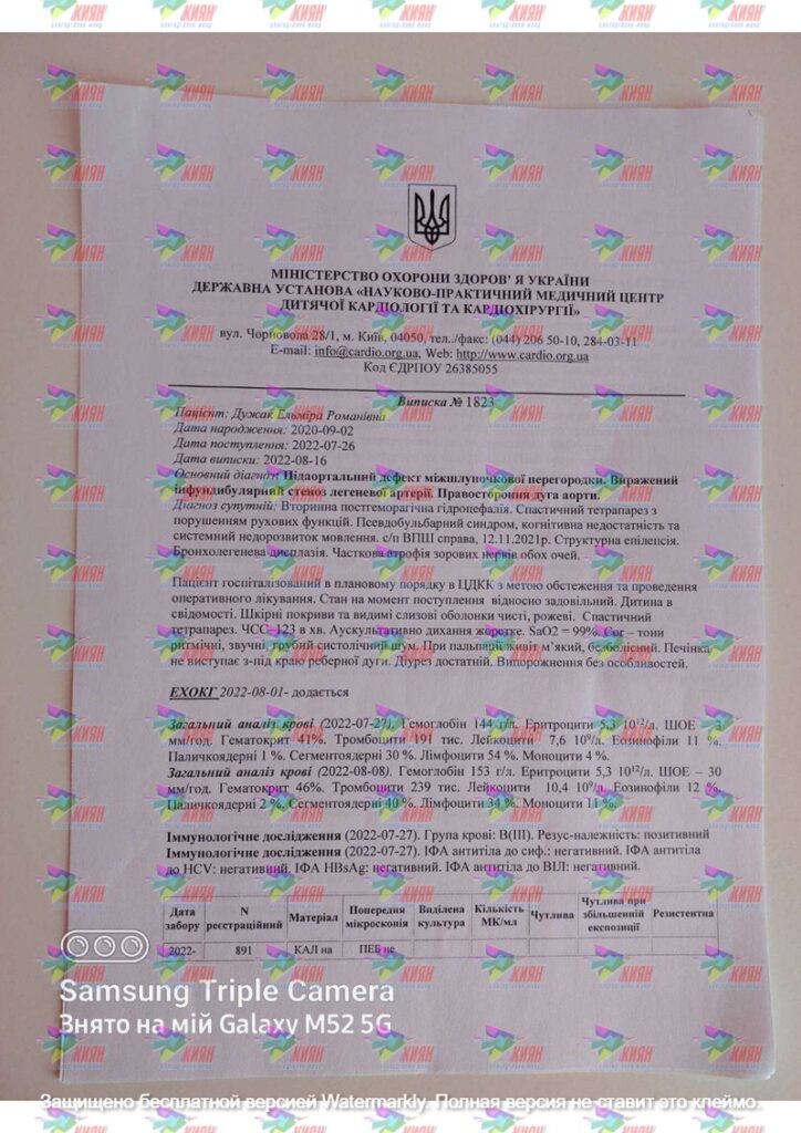 Діагноз: підаортальний дефект міжшлуночкової перегородки. Виражений інфундибулярний стеноз легеневої артерії. Правостороння дуга аорти. Вторинна постгеморагічна гідроцефалія. Спастичний тетрапарез з порушенням рухових функцій. Псевдобульбарний синдром, когнітивна недостатність та системний недорозвиток мовлення. Структурна епілепсія. Бронхолегенева дисплазія. Часткова атрофія зорових нервів обох очей