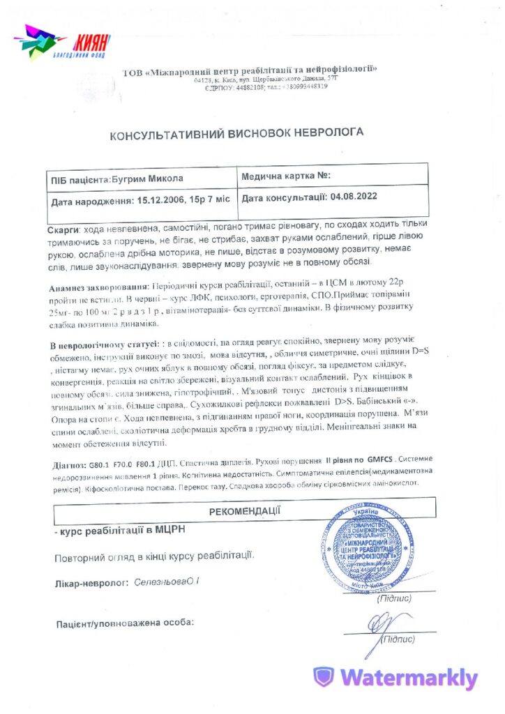 Діагноз: G80.1, F70.0, F80.1, ДЦП, спастична диплегія. Рухові порушення ІІ рівня по GMFCS. Системне недорозвинення мовлення 1 рівня. Когнітивна недостатність. Симптоматична епілепсія (медикаментозна ремісія). Кіфосколітична постава. Перекос тазу. Спадкова хвороба обміну сірковмісних амінокислот