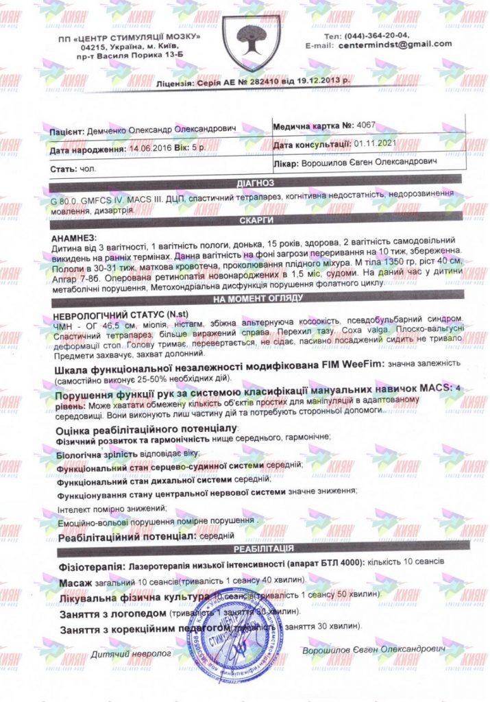 У рік Сашкові діагностували ДЦП, спастичний тетрапарез 4 рівня, ваду зору і затримку психомовленнєвого розвитку. За свої 5 років цей хлопчик відвідав багато лікарень і реабілітаційних центрів. Постійні візити до реабілітологів і заняття вдома приносять позитивні результати. Ця сім’я не боїться труднощів, проте нестача фінансів не дає можливості лікувати Сашка власними силами.