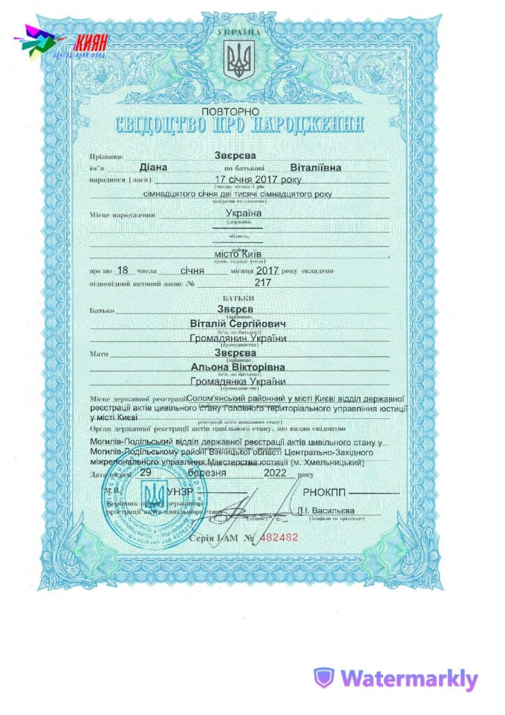 Повне ім’я: Звєрєва Діана Віталіївна, 17.01.2017 р.