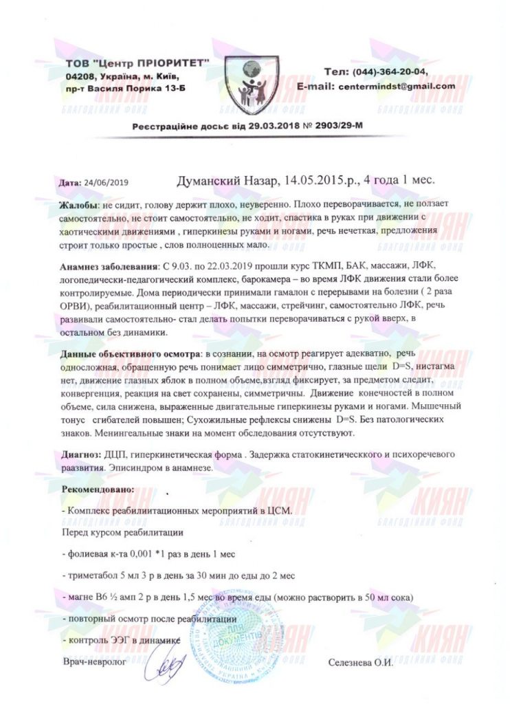 Коли хлопчика виписали, він був дуже слабким, не хотів нічого їсти, самостійно не тримав голівку, а згодом так і не зміг сидіти, перевертатися і повзати. Так пройшов перший рік життя Назара. І саме тоді у нього діагностували ДЦП і затримку психо-мовленнєвого розвитку.За плечима цього сильного хлопчика вже чимало пройдених курсів лікування: він проходив реабілітації і в Україні, і за її межами. Результати очевидні: м’язовий тонус в ручках і ніжках Назара знизився, натомість об’єм пасивних та активних рухів в суглобах збільшився, хлопчик почав контролювати свої «зайві» рухи.