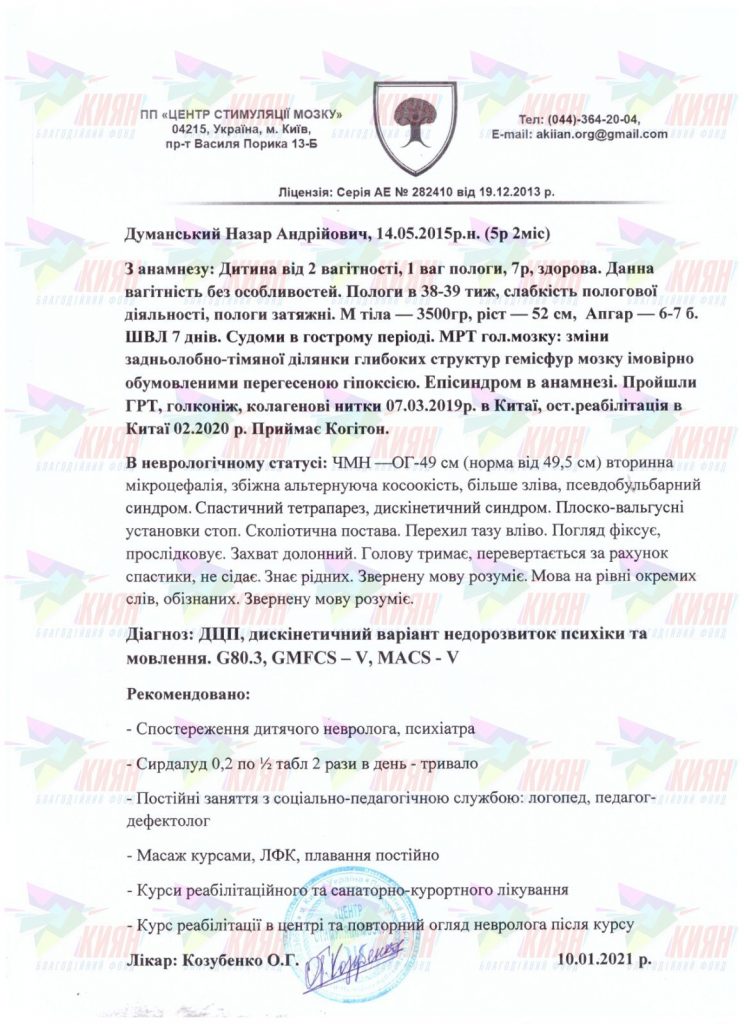 Зараз Назарові майже 6 років, і лише завдяки постійним реабілітаціям хлопчик старається наздогнати своїх однолітків у розвитку. Назар проходить систематичне лікування в реабілітаційних центрах і займається вдома – все, аби не зупинятися на півдорозі і бути здоровим хлопчиком.