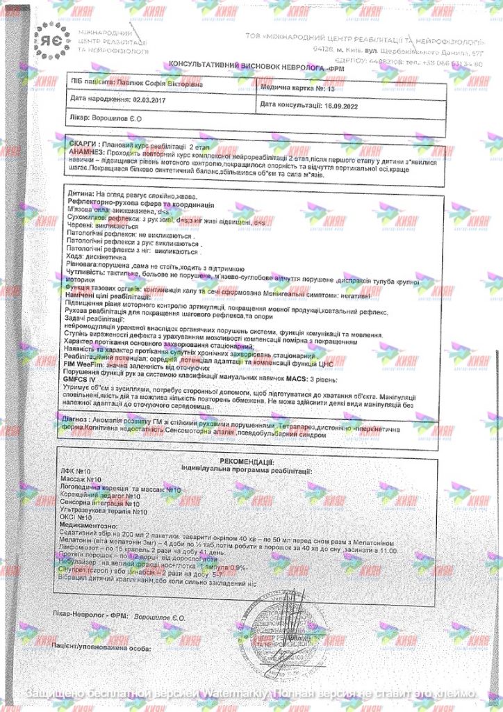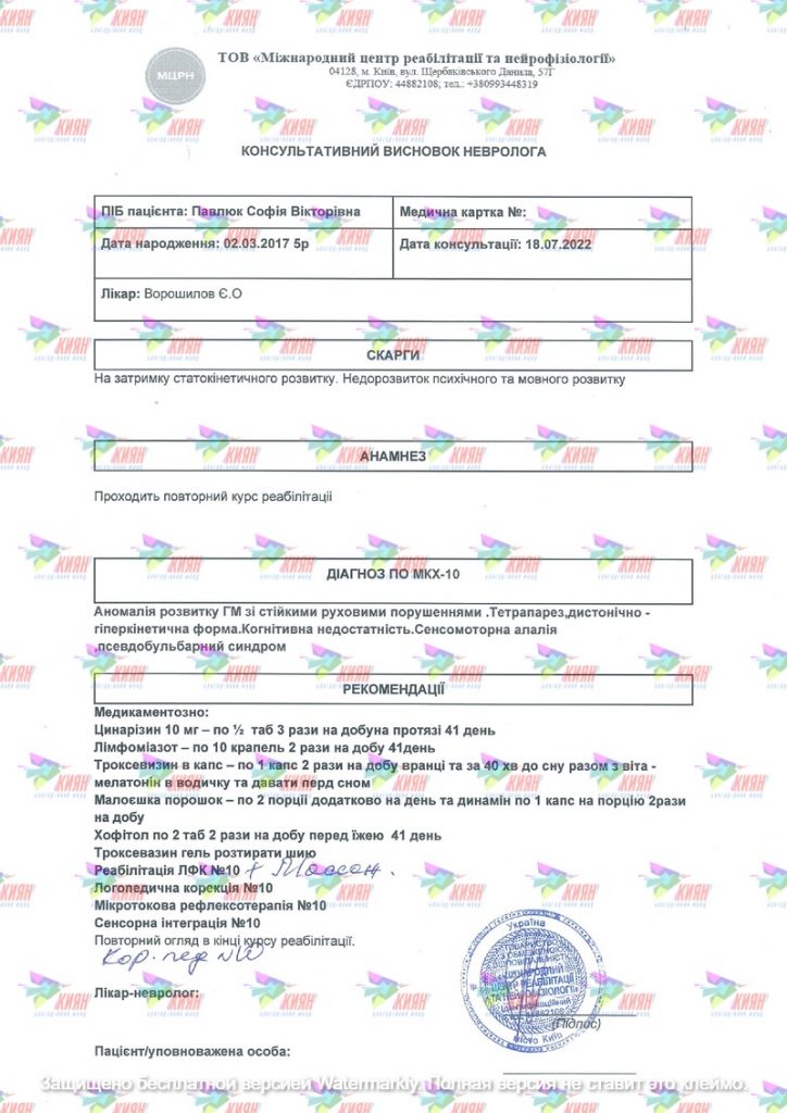 Діагноз: аномалія розвитку головного мозку, мікроцефалія, рухові порушення.