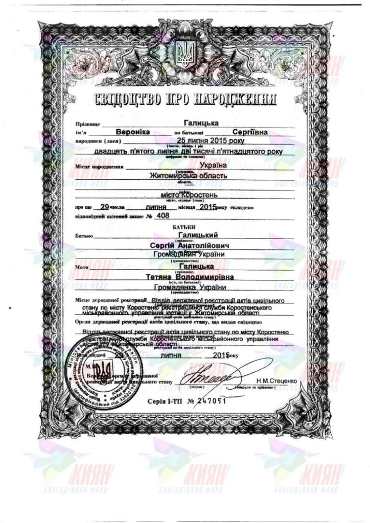 Ім’я: Галицька Вероніка Сергіївна, 25.07.2015 р.