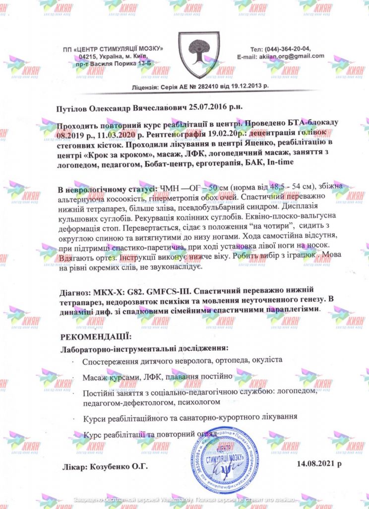 Час ішов, але у 6-місячному віці Сашко не намагався самостійно сидіти, тоді після численних консультацій лікарі діагностували в хлопчика спастичний тетрапарез неуточненого генезу, пізніше до нього додалася ще затримка психічного і мовленнєвого розвитку. Лікарі рекомендували Сашкові проходити систематичні реабілітації, які допоможуть йому покращити стан здоров’я.
