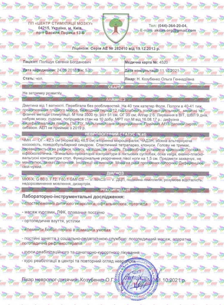 Діагноз: ДЦП, спастичний тетрапарез зі стійкими руховими порушеннями, вираженою затримкою психомовного розвитку, вторинною мікроцефалією, симптоматична епілепсія, поліморфні і генералізовані напади, резистентні до антиконвульсивної терапії