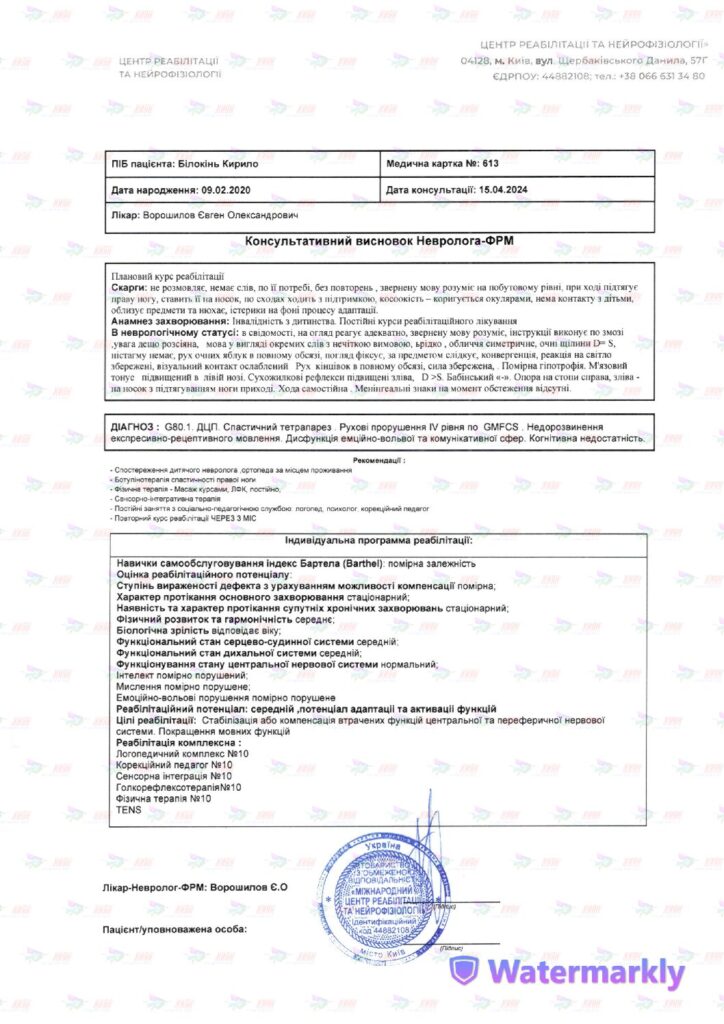 Діагноз: G 80.1 ДЦП. Спастичний тетрапарез. Рухові порушення IV рівня по GMFCS. Недорозвинення експресивно-рецептивного мовлення. Дисфункція емоційно-вольової та комунікативної сфер. Когнітивна недостатність