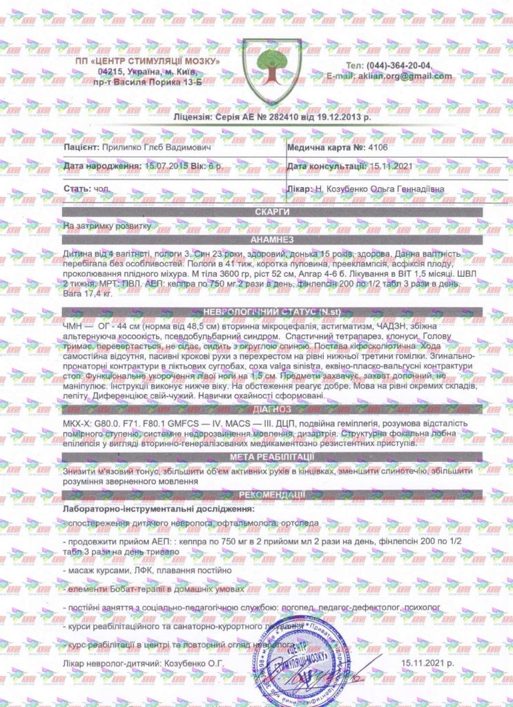 Згодом у Гліба діагностували ДЦП, симптоматичну епілепсію та затримку психомоторного розвитку.