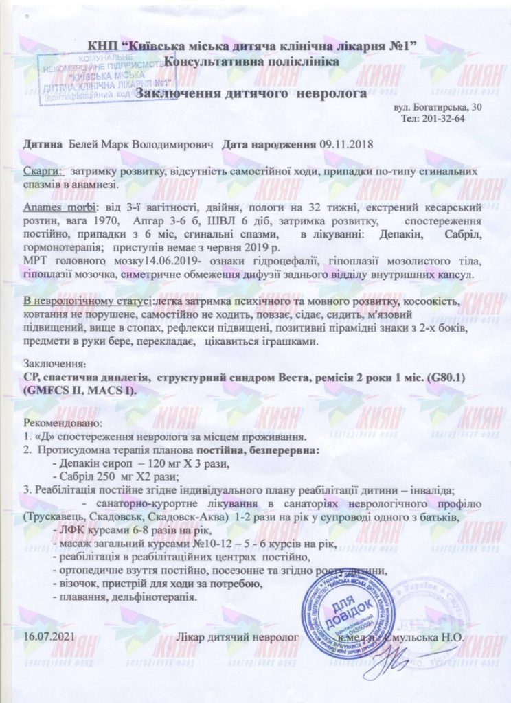 Ім’я: Белей Марк Володимирович, 09.11.2018 р. Місто: Київ Діагноз: СР, спастична диплегія, структурний синдром Веста, ремісія 2 роки 1 міс. (G80.1) (GMFCS II, MACS I)