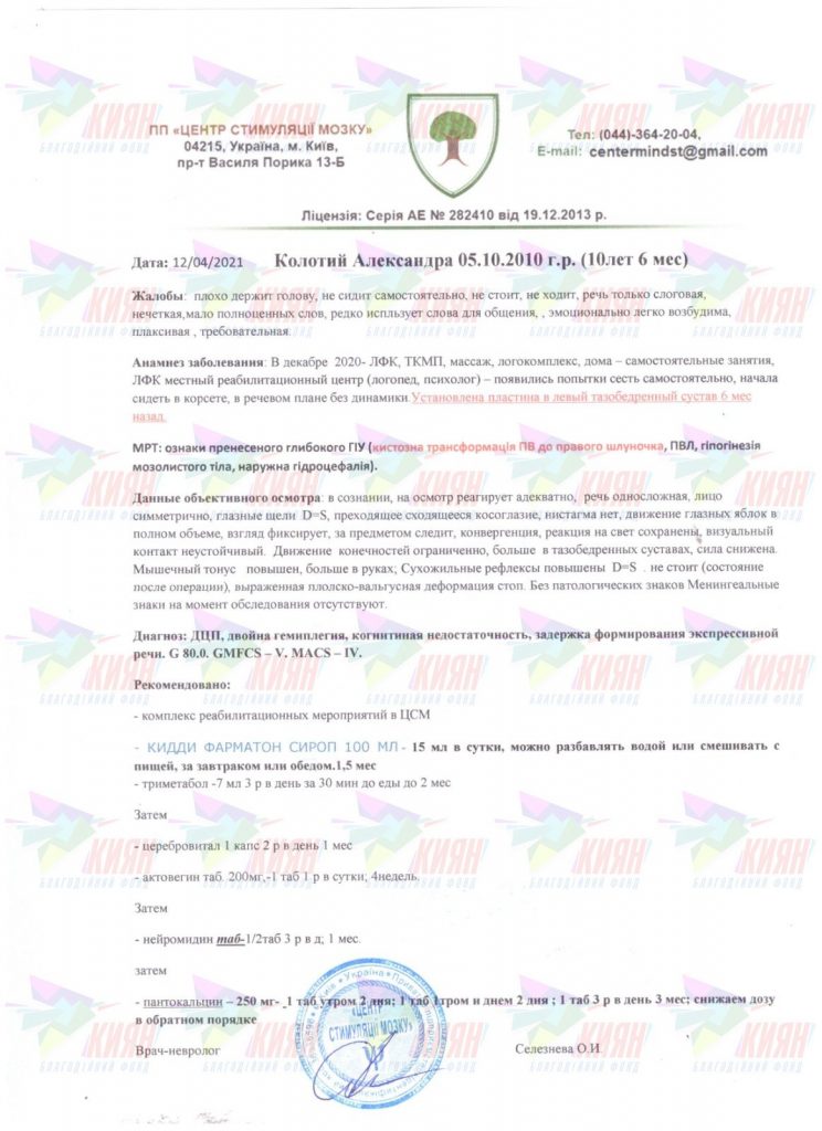 Діагноз: ВВР головного мозку, ДЦП (подвійна геміплегія, спастичний тетрапарез), епісиндром, вивих та підвивих кульшових суглобів, часткова атрофія зорових нервів