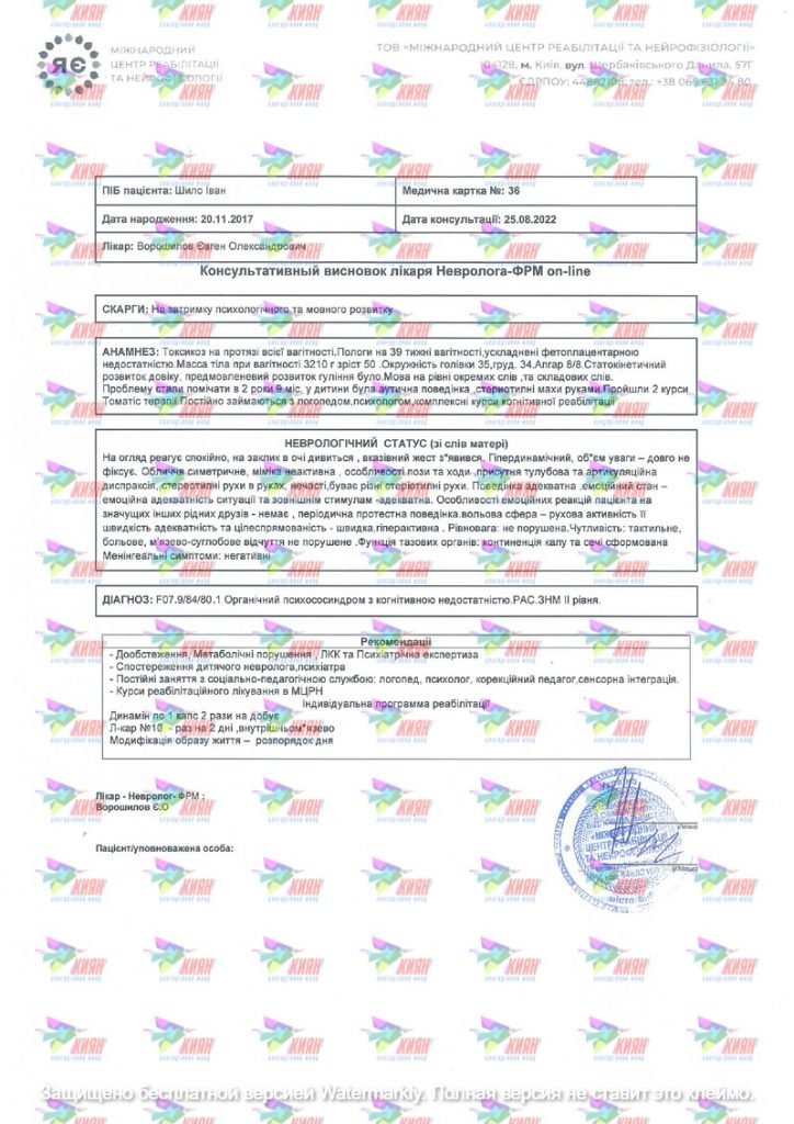 Діагноз: F07.9/84/80.1 Органічний психосиндром з когнітивною недостатністю. РАС. ЗНМ ІІ рівня