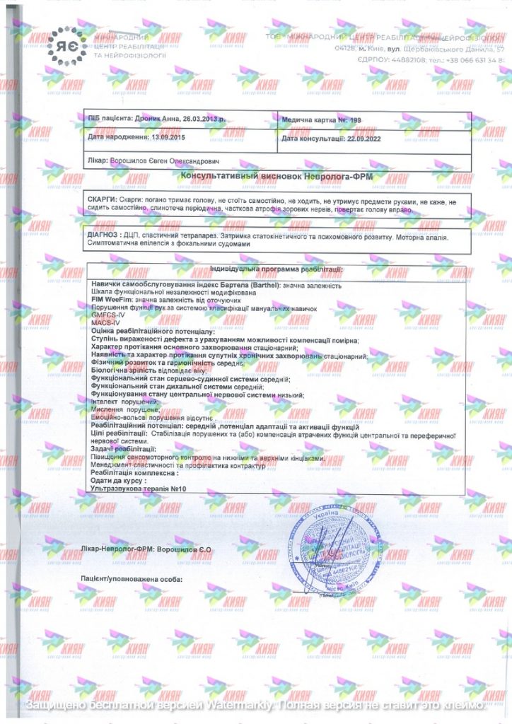 Діагноз: ДЦП, спастичний тетрапарез. Затримка статокінетичного та психомовного розвитку. Моторна алалія. Симптоматична епілепсія з фокальними судомами.