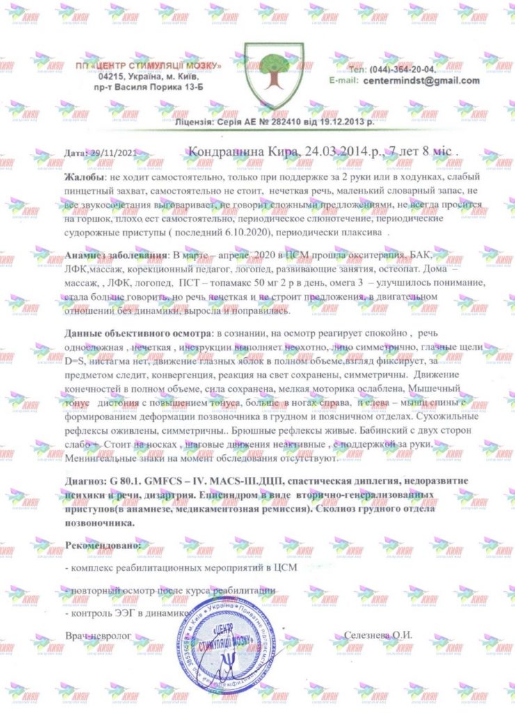 Згодом у Кіри діагностували епісиндром, затримку розвитку і ДЦП, пізніше почали проявлятися супутні хвороби – дисплазія тазостегнових суглобів та проблеми з серцем і нирками. Зараз Кірі 7 років, і весь цей час дівчинка проходила лікування, завдяки якому в неї зменшилися напади епілепсії і вдалося подолати супутні діагнози. Проте лікування ДЦП – це постійна і кропітка робота, яку не можна переривати.