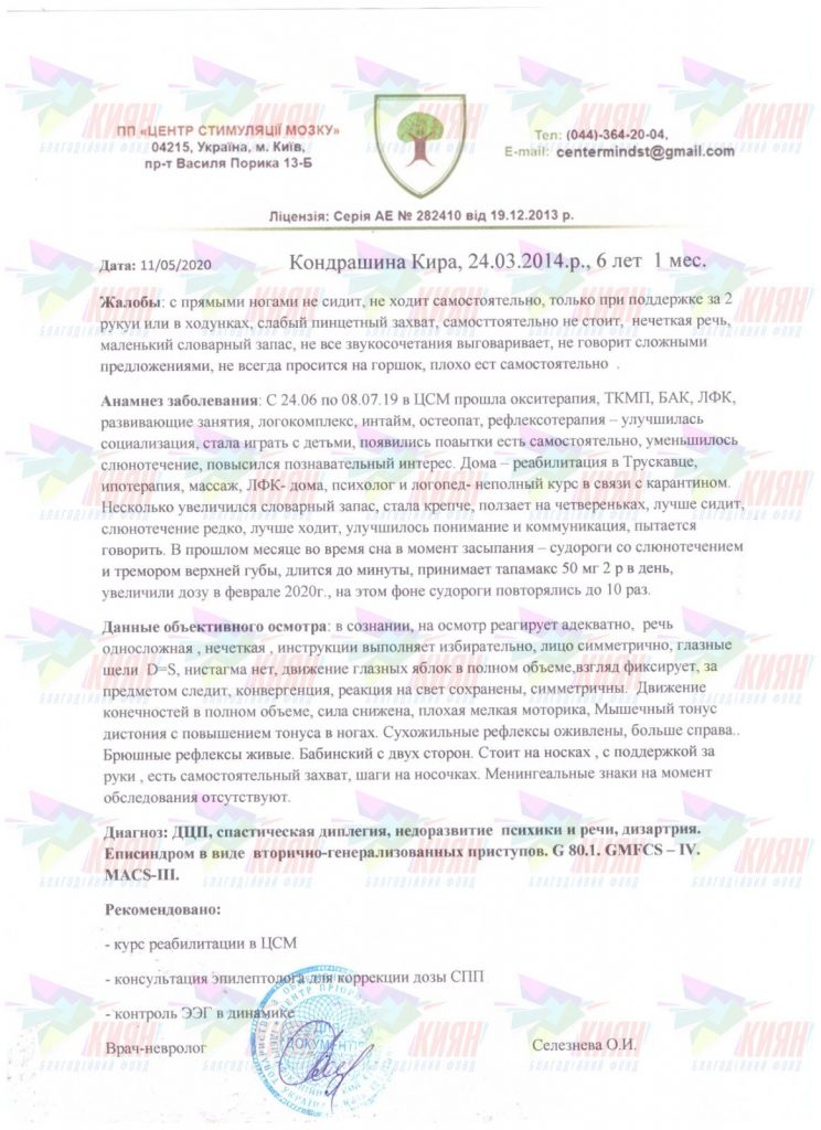 ДЦП, затримка психо-мовленнєвого розвитку та епісиндром, а далі ще гірше: проблеми з серцем, нирками, дисплазія тазостегнових суглобів. Як таке могло статися з новонародженою дівчинкою? Такі думки краяли серце мами, проте вона не опустила руки, а почала боротися за здоров’я своєї донечки. Боротьба із основним та супутніми діагнозами триває й досі.За свої 6 років Кіра бачила чимало реабілітаційних курсів, медпрацівників та добрих людей, які бажали їй одужання та щасливого дитинства без болю. Дівчинка старається виконувати всі показання та мужньо проходить усі реабілітації, і вже має нові навички: її дрібна моторика значно покращилася, дівчинка стала більш контактною і відкритою до спілкування, тонус у кінцівках значно знизився. Лікарі хвалять Кіру, у неї хороша динаміка.
