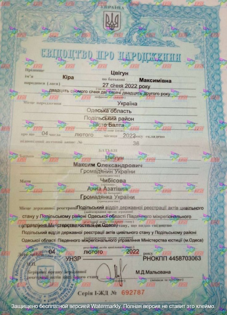 Ім’я: Цвігун Кіра Максимівна, 27.01.2022 р.