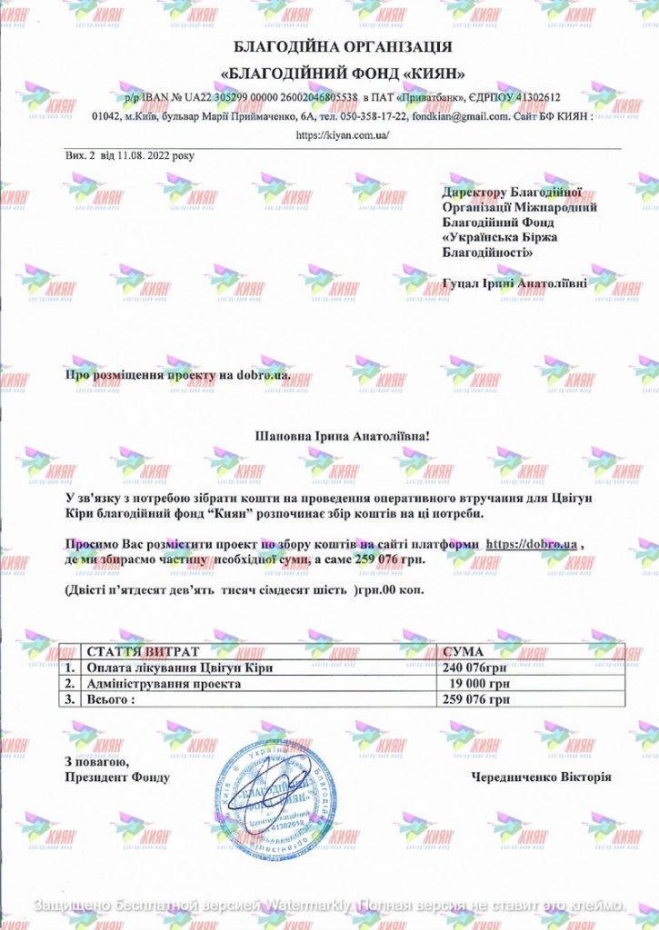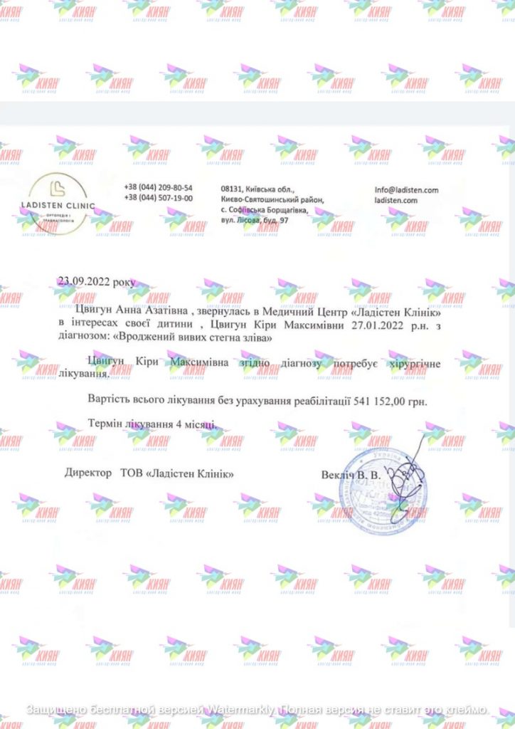 На щастя, дівчинці можуть допомогти: медики столичної лікарні запропонували Кірі лікування з мінімальним оперативним втручанням у суглоб. Воно відбувається із допомогою апарата Векліча – це апарат зовнішньої фіксації, який допоможе подовжити ніжку і зафіксувати її у правильному положенні. Термін лікування – 3 місяці, вартість операції 541 152 грн. На жаль, батьки, які витратили всі збереження на попереднє лікування донечки, не мають таких коштів. А операція – це чи не єдиний шанс на здорове дитинство для Кіри.