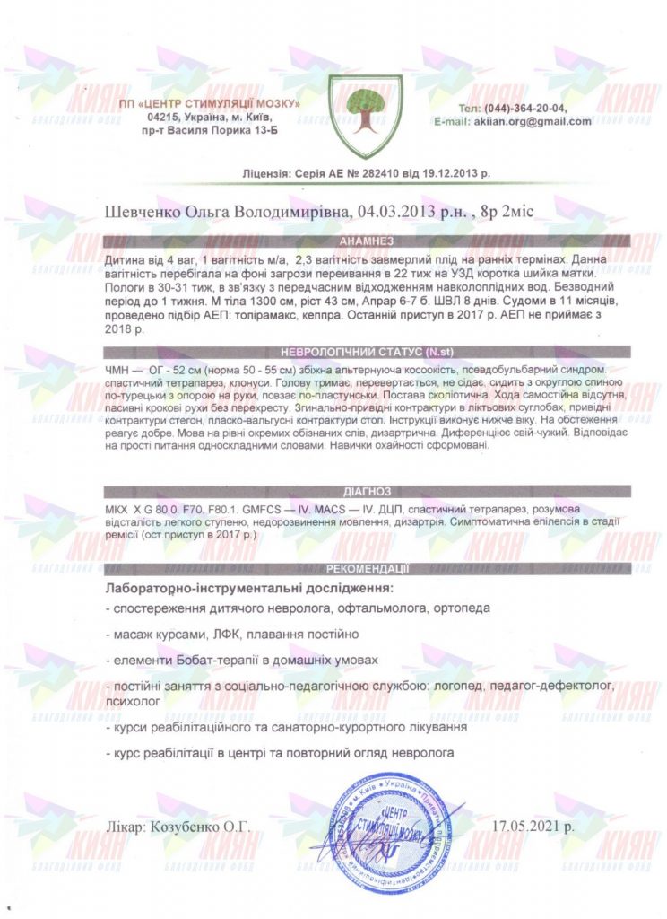 Діагноз: ДЦП, спастичний церебральний параліч, спастичний тетрапарез, симптоматична міоклонічна епілепсія в анамнезі, загальне недорозвинення мови, косоокість