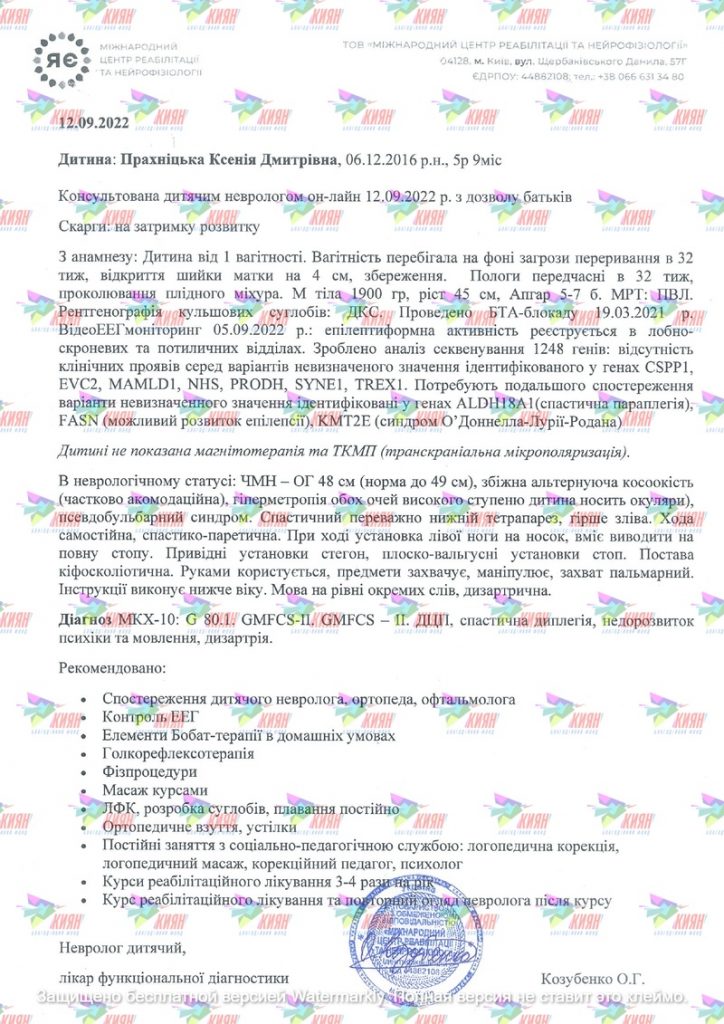 Скоро дівчинці виповниться 6 років, і завдяки попереднім курсам лікування вона вже бігала, засвоювала нові звуки, стала спокійною, її мʼязи стали розслабленими. Ксенія почала проявляти інтерес до всього нового, уважно слухала інструкції і виконувала їх в ігровій формі. Прогрес стану був очевидним.