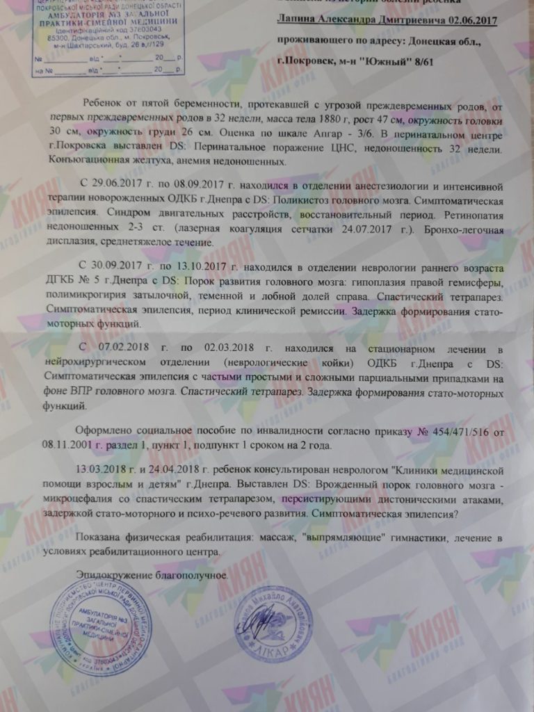 Диагноз:мікроцефалія зі спастичним тетрапарезом, дистонічними атаками, затримкою статомоторного і психо-мовного розвитку