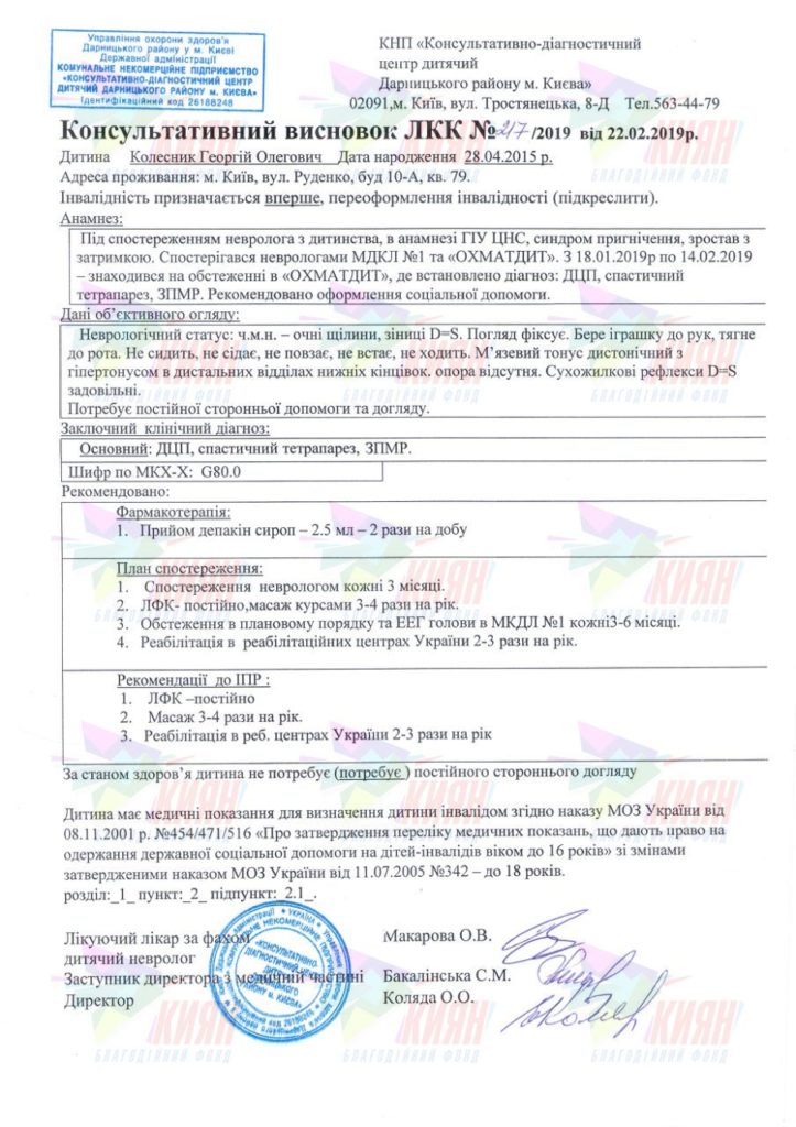 За весь цей час хлопчикові провели безліч генетичних аналізів і консультацій, згідно з якими все було в нормі. Однозначного діагнозу, крім ДЦП, досі не встановлено. Проте з хлопчиком багато займаються вдома, він проходить ЛФК, масажі, дельфінотерапію, кліматотерапію, реабілітації в санаторіях…
