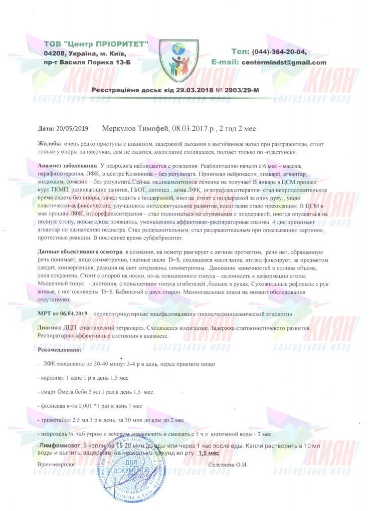 А вдома хлопчик поводив себе дуже нервово, у нього з’явилася косоокість, час від часу Тимофій переставав дихати, його тіло синіло… Після візиту до невролога земля пішла з-під ніг батьків: виявляється, у їх сина гіпертонус, спастичний тетрапарез і рідина в голівці, яка заповнила 10% мозку. Вихід був один: терміново починати лікування.Зараз Тимоші вже 2 роки, і хоч він пройшов не один курс лікування, але у нього досі залишились ознаки гіпертонуса, які виявляється через косоокість, викручування рук, стоянні на пальчиках і зупинку дихання. Прикро, але хлопчик досі не робить того, що у його віці вже вміють його однолітки.