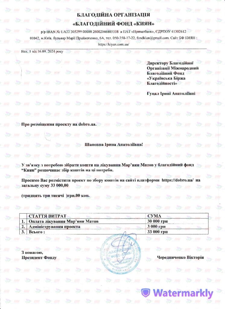 Діагноз Марʼяни – дитячий церебральний параліч (ДЦП) та відставання в психомоторному розвитку. Лікарі вважають її дуже цілеспрямованою дитиною з великим потенціалом. Для того, щоб вона могла розвиватися максимально ефективно, Марʼяні необхідні постійні реабілітаційні заходи. Це включає заняття з фізичними терапевтами, логопедами, психологами, бобат-терапевтами, ортопедами та навіть уроки плавання. Всі ці процедури вимагають значних фінансових витрат, які стають все важчими для родини.
