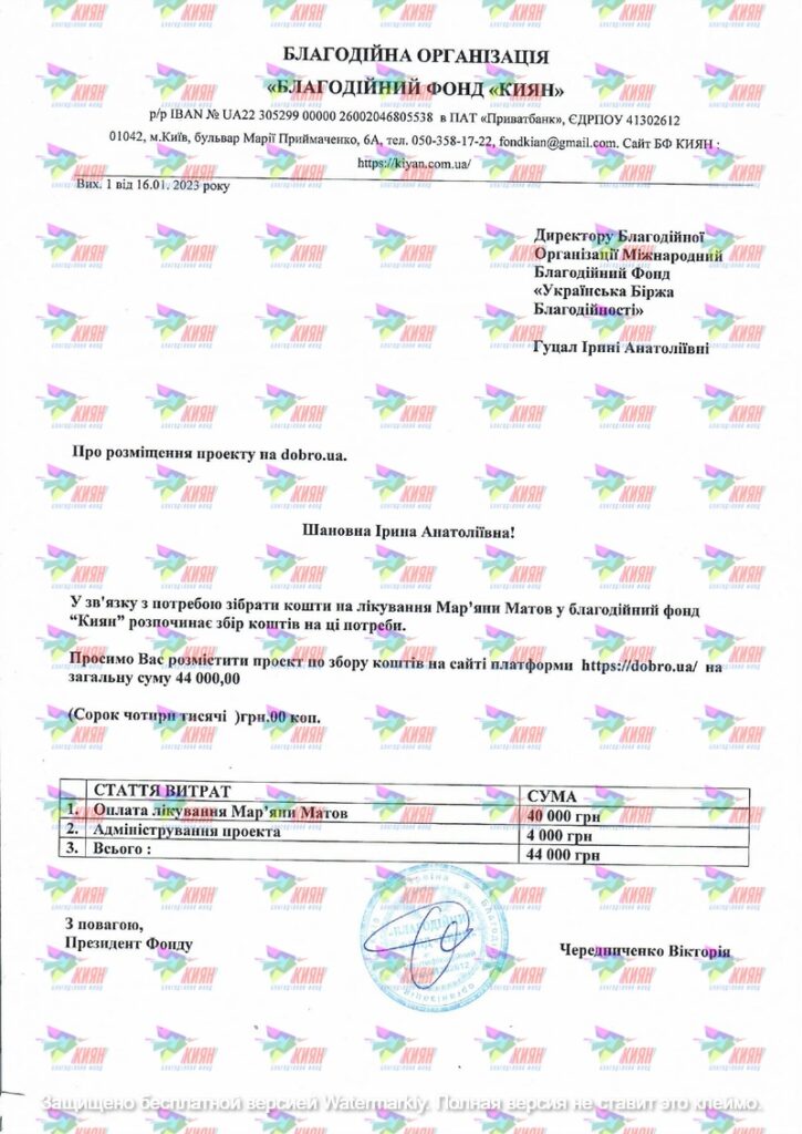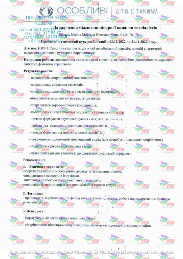 Марʼянка дуже відстає у розвиткові від своїх однолітків, проте лікарі стверджують, що вона дуже цілеспрямована і перспективна. Їй рекомендовані постійні реабілітації, заняття із логопедом, психологом, бобат-терапевтом, а також ЛФК, масажі, плавання тощо. Все це створює величезне навантаження на сімейний бюджет, батьки Марʼяни вже не можуть впоратися із рахунками на лікування, у сімʼї працює лише тато, але відмовитися від реабілітації означає поставити хрест на розвитку дитини. Вони щодня старанно займаються із донечкою вдома, і все це приносить гарні результати. Витрачено вже так багато сил, тому зупинятися зараз просто не можна!