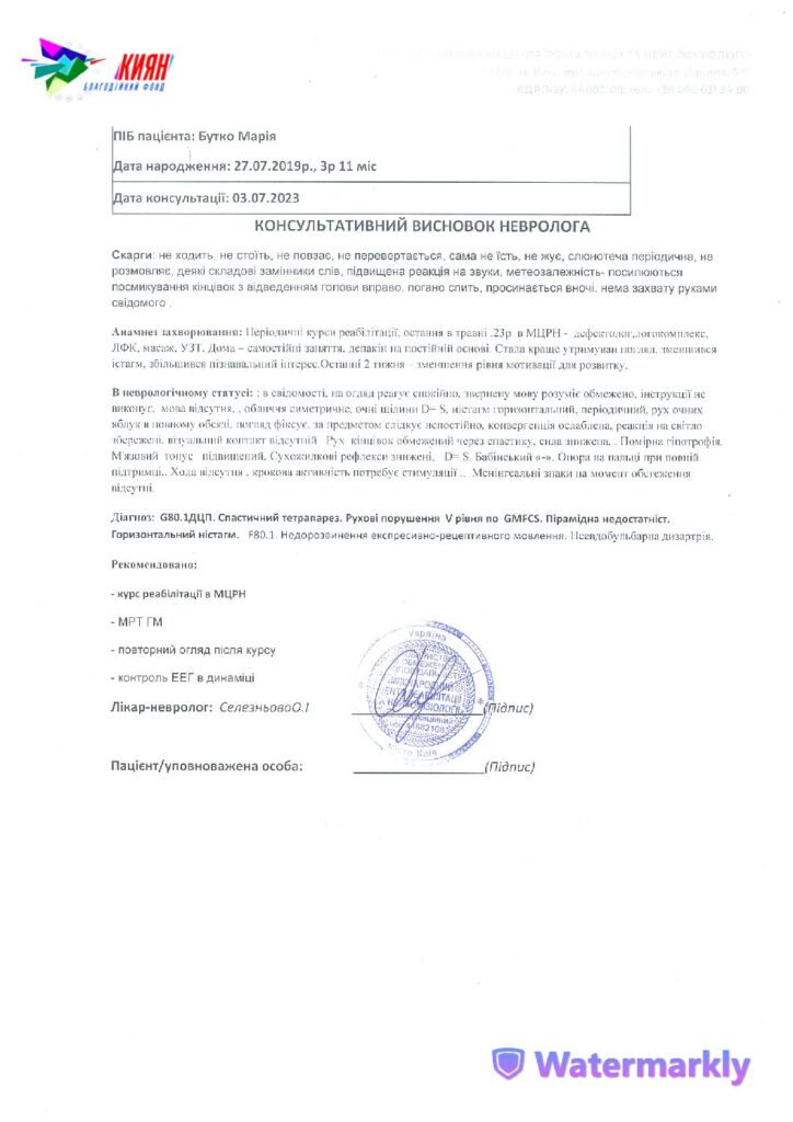 Діагноз: ДЦП, спастичний церебральний параліч з важкими руховими порушеннями у вигляді спастичного тетрапарезу. Затримка усіх видів розвитку. Симптоматична епілепсія