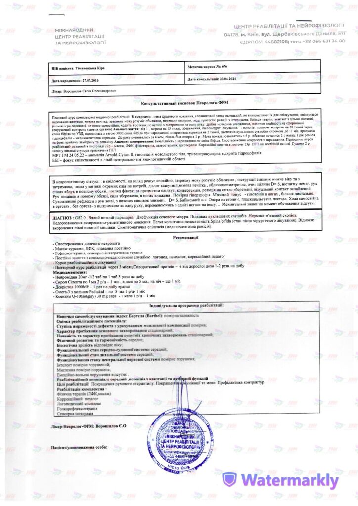 Діагноз: G82.0 Млява параплегія. Spina Bifida. Нервово-м’язова дисфункція сечового міхура. Патологічне зміщення і підвивих суглобів. Стан після оперативного лікування двобічного підзвиху голівок стегнових кісток. Розщілина хребта в поперековому відділі з гідроцефалією