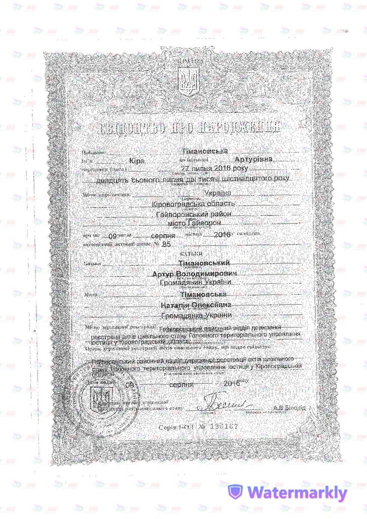 Повне ім’я: Тімановська Кіра Артурівна, 27.07.2016 р.