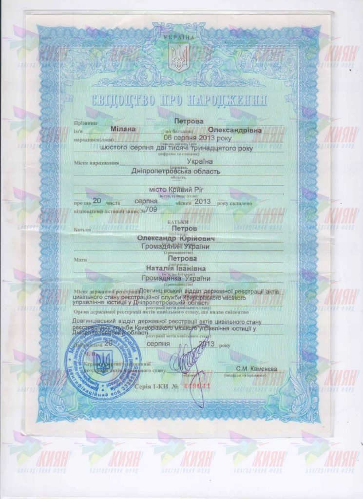 Ім’я: Петрова Мілана Олександрівна, 08.08.2013 р.