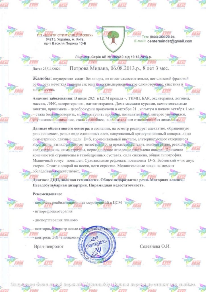 Діагноз: спастичний тетрапарез з вираженими руховими порушеннями в вигляді відсутності самостійного сидіння, ходи, ураження ЦНС, затримка психічного розвитку