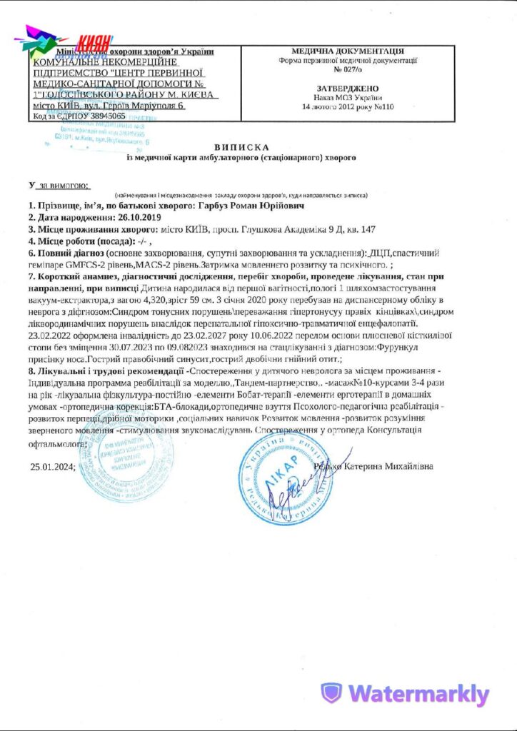 Гарбуз Роман – 4-річний хлопчик, якому зараз дуже потрібна реабілітація. Його історія розпочалася з важких пологів та гіпоксії, а в рік Ромчикові діагностували ДЦП, правосторонній геміпарез, затримку мовленнєвого та психічного розвитку. Лікування було розпочато відразу: терапія, реабілітація, заняття з логопедом, лікувальна фізкультура, сенсорна інтеграція… Одним словом – батьки робили та досі роблять усе, що в їх силах, аби стан їх сина покращився.